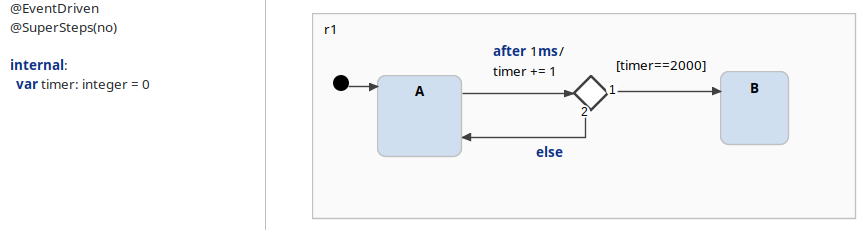 instead of just creating a transition from A to B labeled after 2s. This serves no purpose whatsoever. It is unnecessarily complex, and the generated code will be less performant. Don't do this!