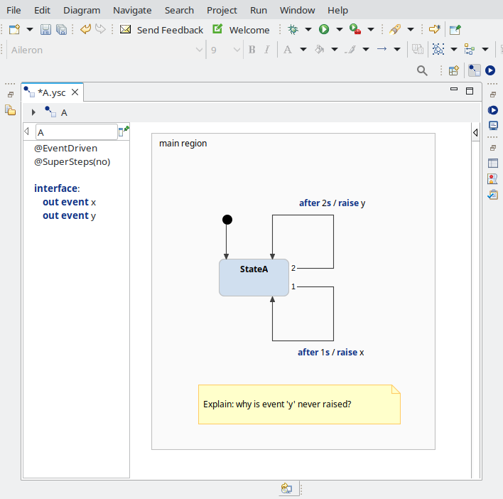 The exercises can be found in the StartingPoint git repository. In the `exercises' directory, you'll find 5 files (A.ysc, B.ysc, ...). Each of them is a Statechart model that you should open in itemis CREATE. Each model includes a question (in a 'comment' element). You must answer this question, and include your answer in your report.