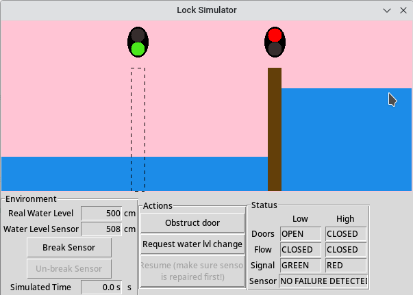 Note: The integer parameter for the events openDoors, closeDoors, openFlow, closeFlow, greenLight and redLight indicates the side of the lock this action should apply to. Allowed values are 0 (the LOW water side) and 1 (the HIGH water side). In the Statechart interface, the integer constants LOW and HIGH have been declared, so you can (and should) use these, instead of the values 0 and 1.