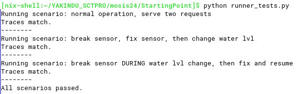 Your solution needs to be precisely correct: superficially correct behavior when running the generated code with the GUI (e.g., seeing the water levels change) is not enough: the timing-related requirements are exact. Hence the role of the automated tests.