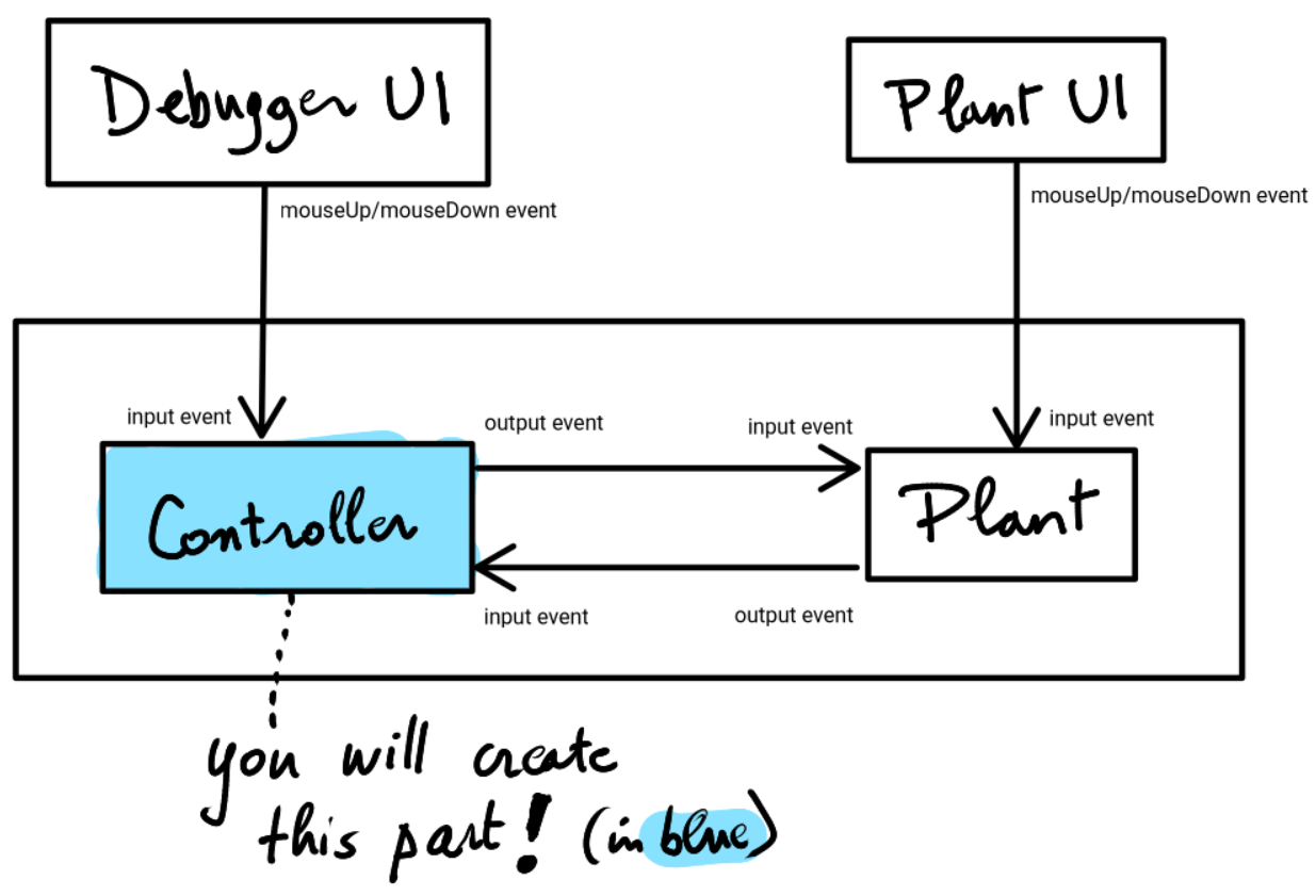 You will implement the plant (= digital watch) controller as a Statechart. The controller only talks to the plant via input-events and output-events. In StateBuddy, you can also interactively raise input events directly into the controller statechart (Debugger UI). Finally, the plant also has its own UI, which sends input events to the plant.